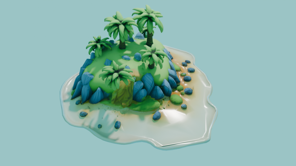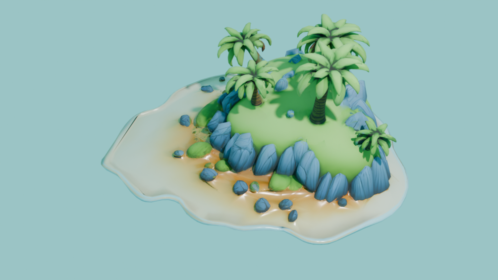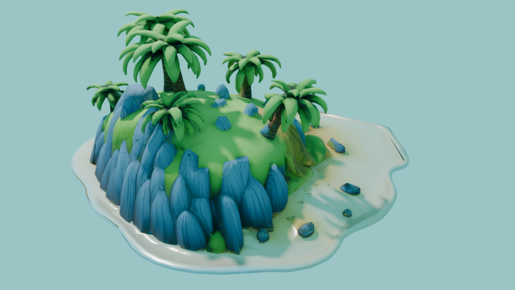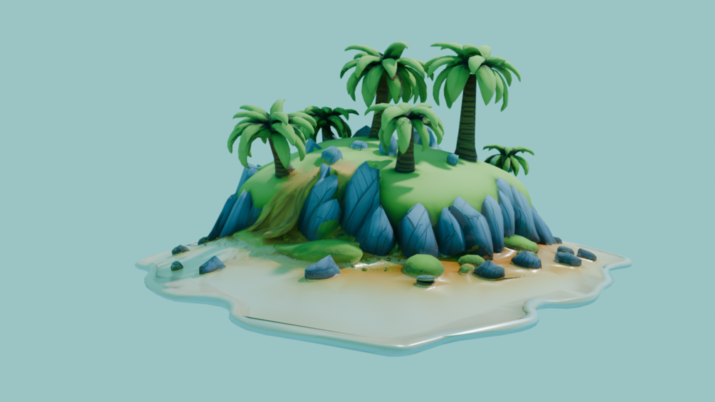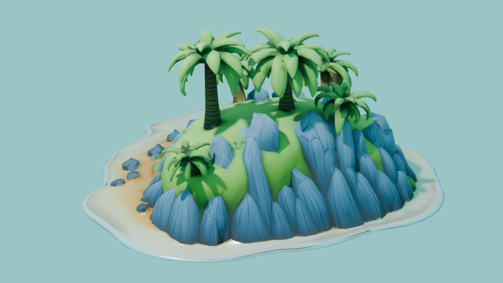 A 3D game asset of a stylized tropical island, featuring a sandy beach, rocky cliffs, and lush palm trees. As a game-ready asset with PBR textures, it's perfect for creating a beautiful stylized environment for real-time projects or animations.