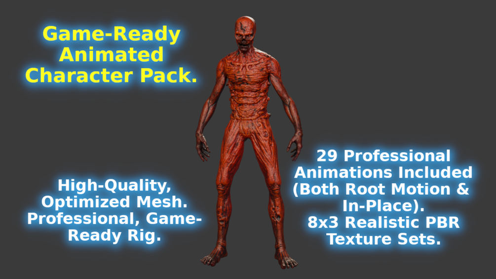 The ultimate, game-ready character solution for your next dark fantasy epic. With 29 professional animations and 8 PBR texture sets, each set includes 3 resolutions: 1K, 2K and 4K. "The Unbegotten" is ready to be the hero or villain of your world, right out of the box.